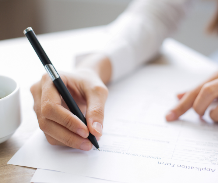 dłoń trzymajaca długopis wypełniająca dokument który leży na stole